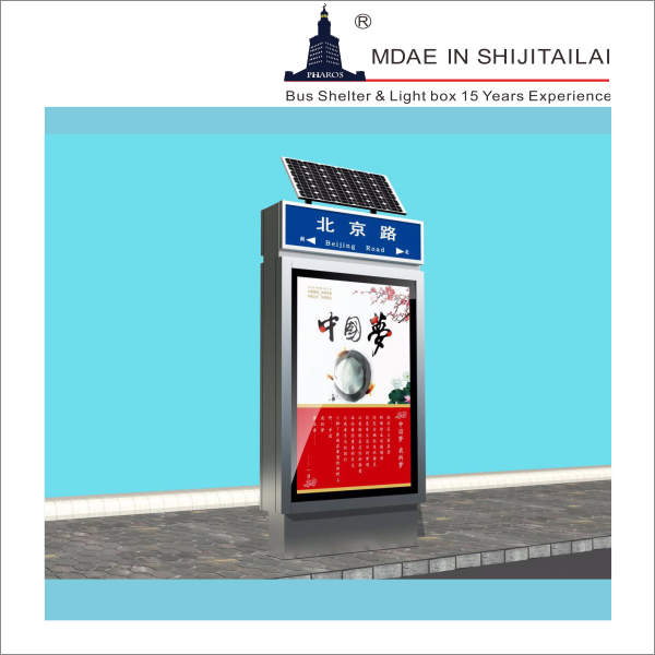 The solar advertising light box is mainly designed according to the new and personalized needs of the advertising market. The solar panel, controller, lead-acid maintenance free battery and ultra-high brightness LED light source are used as the power supply system and light source. At the same time, the high-efficiency nano light-emitting materials are used to make the point light source become the surface light source, with more uniform light-emitting and no ribs; the work is fine and qualitative Excellent quantity and unique shape. The solar power supply system converts and stores electric energy in the daytime, and the box is illuminated at night. Not only save electricity, green environmental protection but also play the role of advertising media and beautifying the environment.